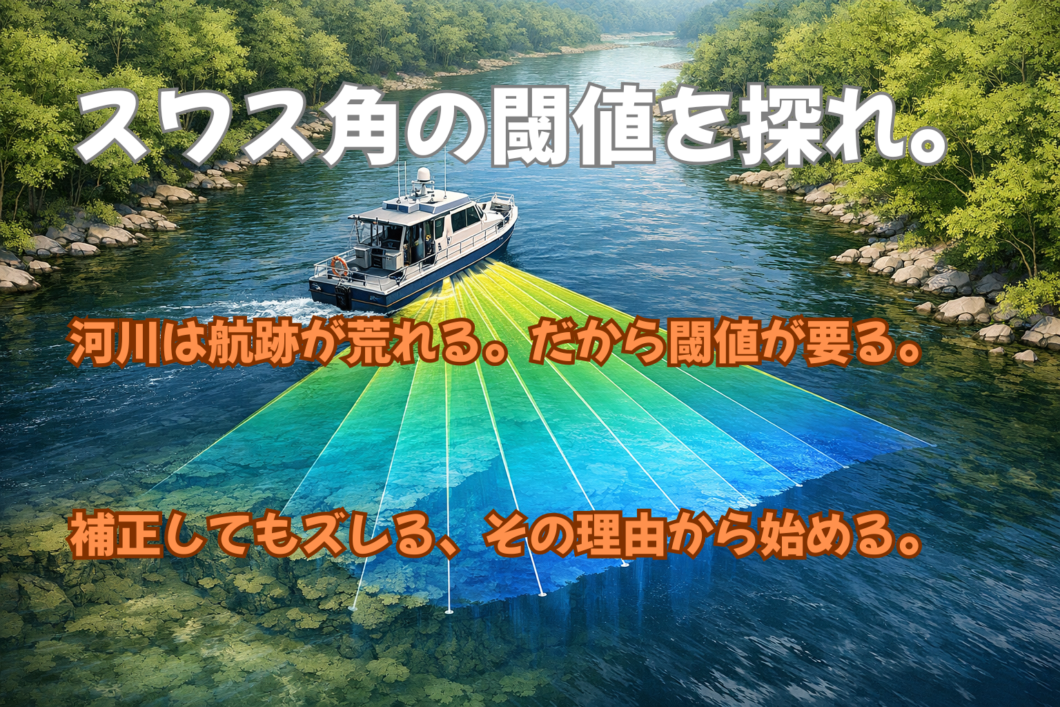 河川のマルチビーム測量では、スワス角を理屈どおりに広げても成果が安定しないことがあります。