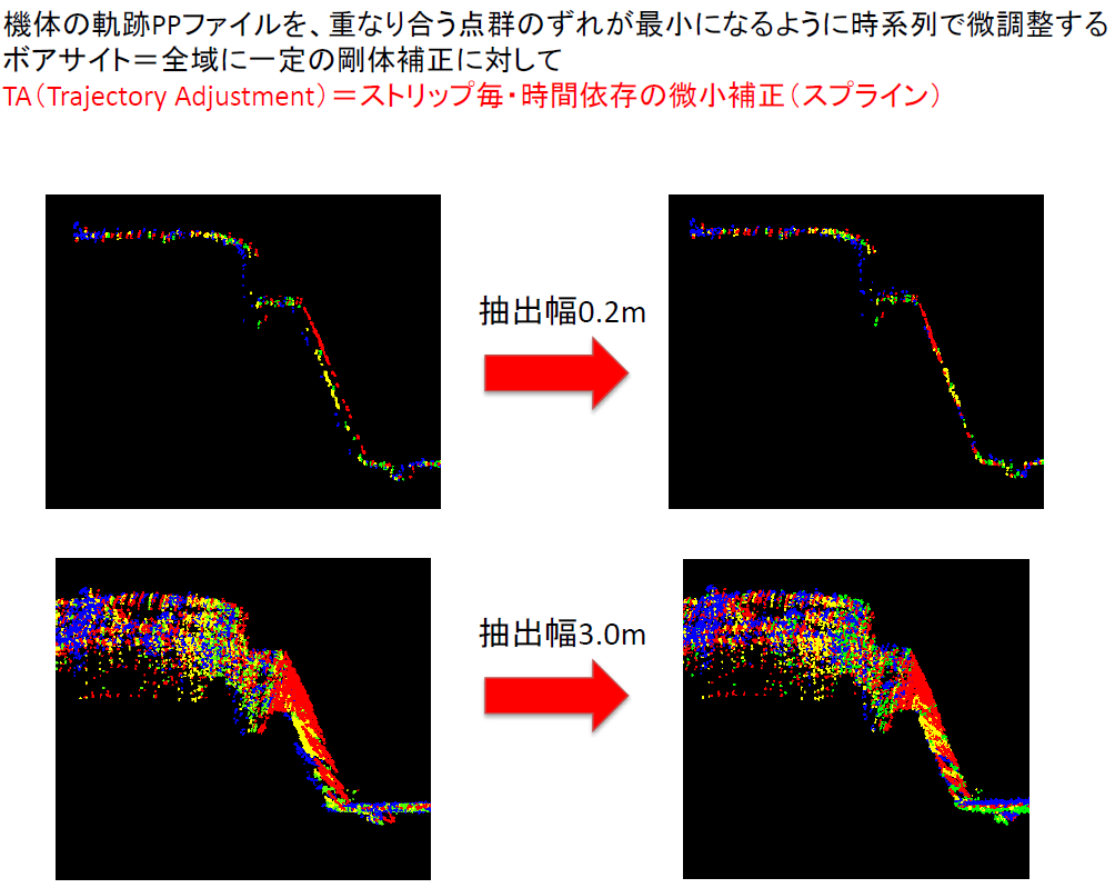 TAは、機体の軌跡PPファイルを、点群同士のズレが最小になるように時系列で微調整します。