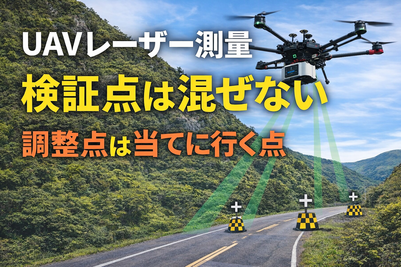 山側は立入制約により検証点を配置できないため、道路側は検証点で評価し、山側はコース間整合と断面確認で品質を確認した。